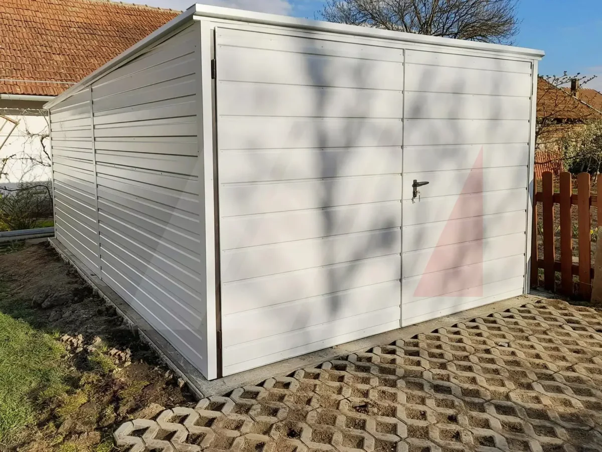 Garáž z trapézového plechu 6m x 6m s výklopnou bránou a dveřmi